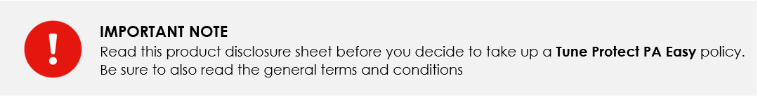 Should you require additional information about Tune Protect PA Easy, please refer to the insurance info booklet on ‘Personal Accident Insurance’ available at all our branches. Alternatively, you may visit our website at https://www.tuneprotect.com/.
